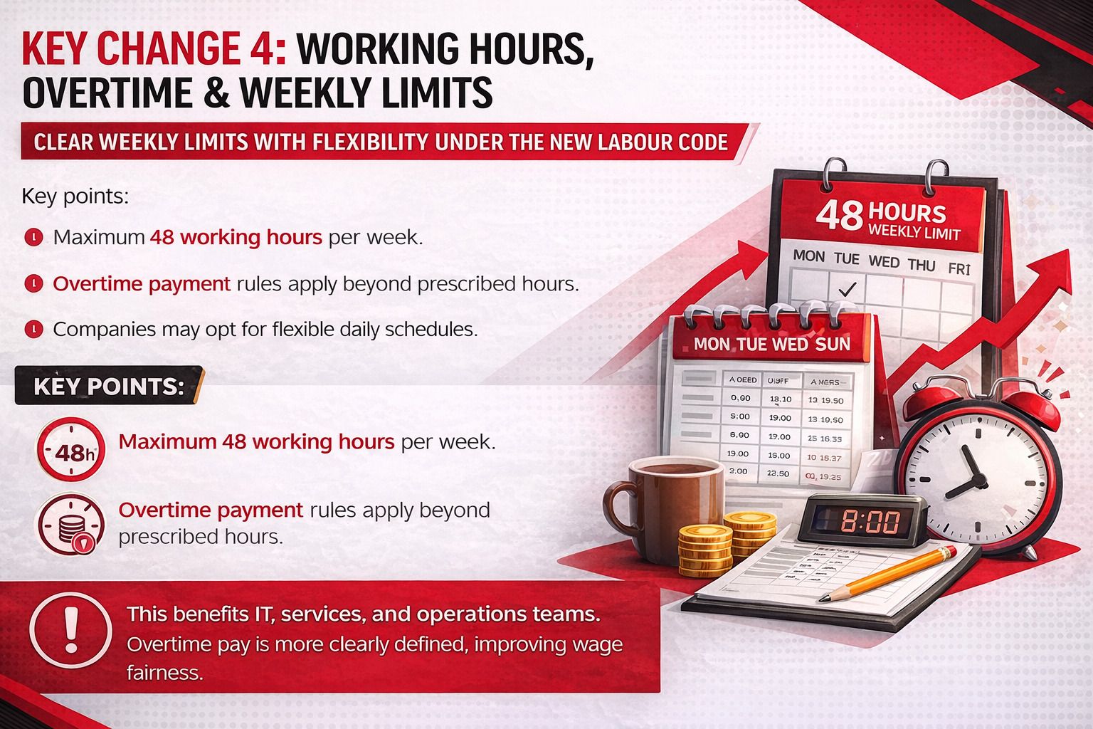 Fourthly, the changes will be with respect to weekly limits to work, overtime payment, and revamped daily schedules. Under the New Labor Code, the employees will enjoy clearer weekly working limits (maximum 48 working hours per week). Furthermore, overtime rules will apply beyond prescribed hours. This is expected to benefit IT, services and operations team.