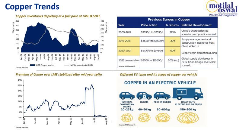 Domestic copper is trading ~27% higher YTD, triggered by US announcing tariffs on copper imports sending shockwaves through global markets and surge in demand from risingEV sales, electrification usage in AI and global energy transition
