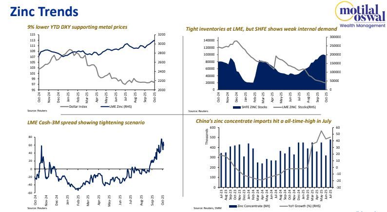 • Zinc prices on LME rose above $3000/tonne in September 2025, posting a ~9% rally YTD, supported by depleting inventories and weaker US dollar
