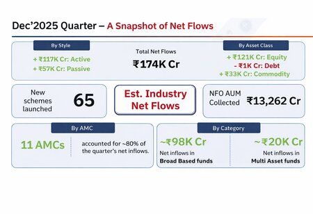 Understanding investor flows offers insight into allocation trends. The latest edition of the Where the Money Flows report examines how capital has been allocated across mutual fund categories for the quarter ending December 2025. The study, leveraging a proprietary 5-tier classification framework, dissects estimated net flows across asset classes—equity, debt, hybrid, commodities and international—while also highlighting the distinction between active and passive strategies. The report provides a comprehensive perspective on allocation patterns during the period..In the December 2025 quarter, the mutual fund industry recorded estimated net inflows of ₹1.92 lakh crore.. Active funds accounted for ₹1.17 lakh crore, while passive strategies accounted for ₹75,000 crore inflows. Equity funds remained a significant contributor, recording net inflows of ₹1.12 lakh crore. Within equities, broad-based funds capturing 88% of active flows and ₹98,000 crores in inflows, underscoring the investor tilt towards diversified strategies. Large-Cap Passive Funds, Flexicap Active Funds and arbitrage strategies accounted for a significant share of flows during the quarter.